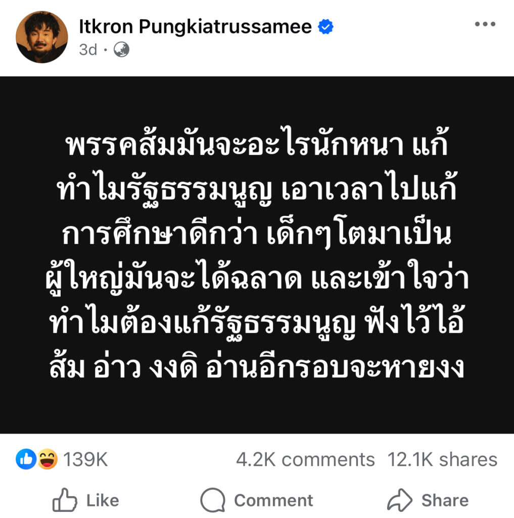 พรรคส้มมันจะอะไรนักหนา แก้ทำไมรัฐธรรมนูญ เอาเวลาไปแก้การศึกษาดีกว่า เด็กๆโตมาเป็นผู้ใหญ่มันจะได้ฉลาด และเข้าใจว่าทำไมต้องแก้รัฐธรรมนูญ ฟังไว้ไอ้ส้ม อ่าว งงดิ อ่านอีกรอบจะหายงง