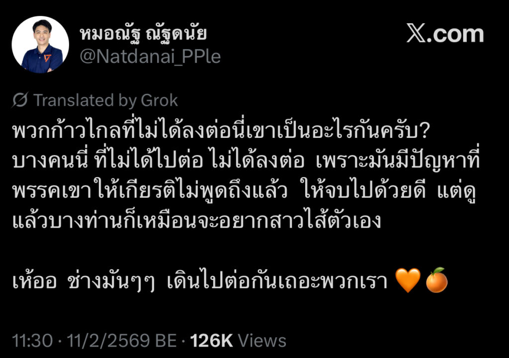 ผู้สื่อข่าวโตโจ้นิวส์รายงานว่า หมอณัฐ ณัฐดนัย ผู้สมัคร สส.บัญชีรายชื่อพรรคประชาชน โพสต์ข้อความผ่านเอ็กซ์ ระบุว่า