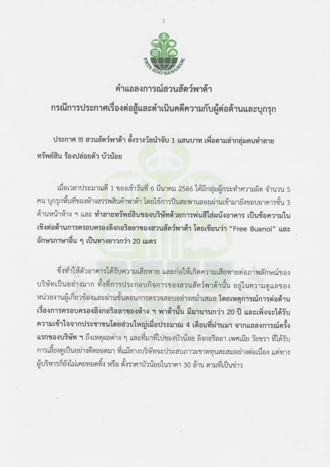 ประกาศ !!! สวนสัตว์พาต้า ตั้งรางวัลนำจับ 1 แสนบาท เพื่อตามล่ากลุ่มคนทำลายทรัพย์สิน ร้องปล่อยตัว บัวน้อย