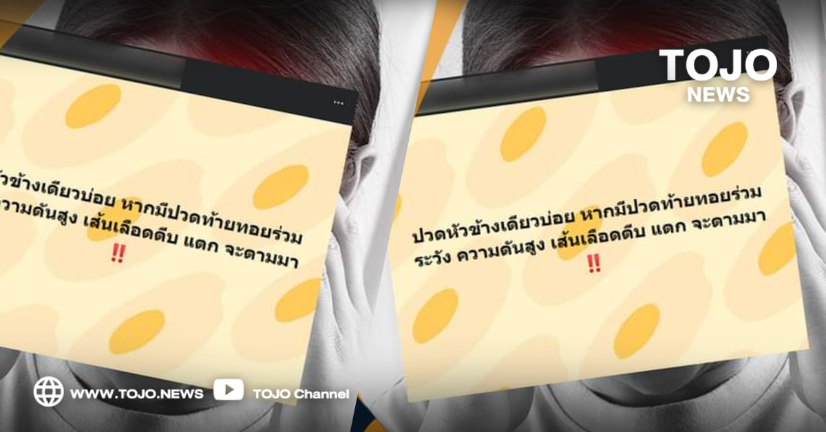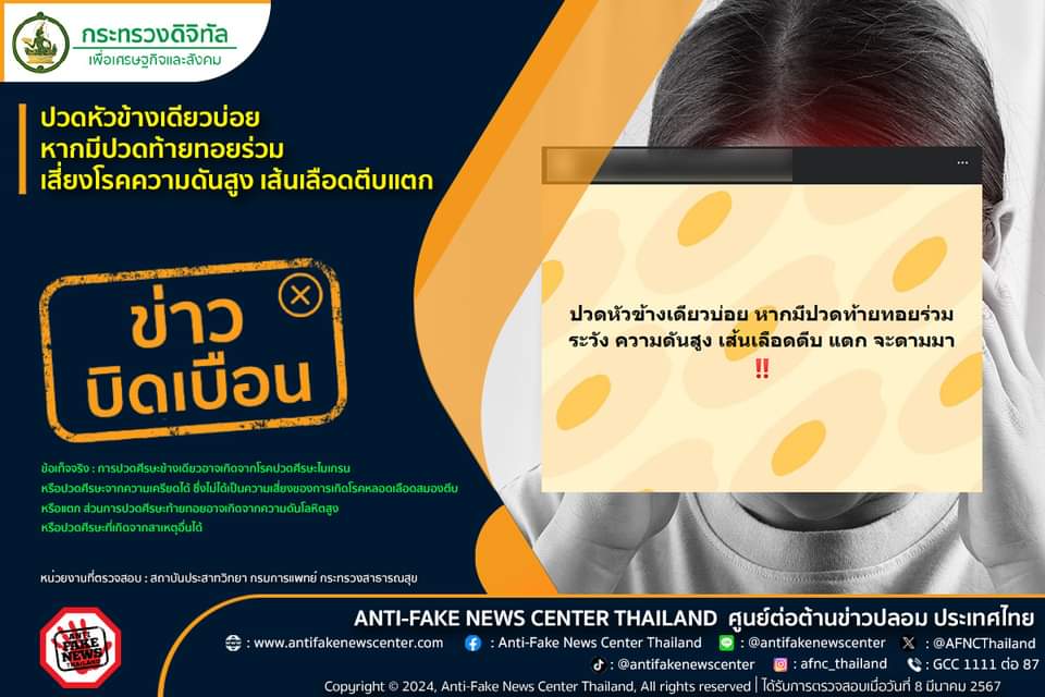 ผู้สื่อข่าวโตโจ้นิวส์รายงานว่า ตามที่มีประเด็นในเรื่องปวดหัวข้างเดียวบ่อย หากมีปวดท้ายทอยร่วม เสี่ยงโรคความดันสูง เส้นเลือดตีบแตก ทางศูนย์ต่อต้านข่าวปลอมได้ดำเนินการตรวจสอบข้อเท็จจริงโดยสถาบันประสาทวิทยา กรมการแพทย์ กระทรวงสาธารณสุข พบว่าประเด็นดังกล่าวนั้น เป็นข้อมูลบิดเบือน