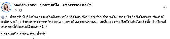 น้ำตาวันนี้ เป็นน้ำตาของผู้หญิงคนหนึ่ง ที่สู้จนหลังชนฝา รู้ว่าเข้ามาต้องเจออะไร ไม่ได้อยากจะร้องไห้ แต่มันจะอ้วก ถ้าพูดภาษาชาวบ้าน ขอความเห็นใจจากแฟนบอลและสื่อมวลชน ถึงยังไงก็ต้องสู้ เพื่อประโยชน์สมาคมที่เป็นสมบัติของชาติ