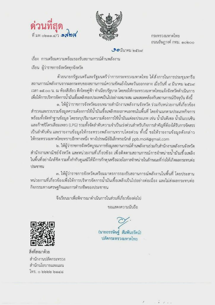 “เพื่อเป็นการสร้างความมั่นใจให้ต่อภาคธุรกิจเอกชนซึ่งเป็นกำลังสำคัญในการขับเคลื่อนกิจกรรมทางเศรษฐกิจของพื้นที่ จึงเน้นย้ำให้ผู้ว่าราชการจังหวัด ได้เตรียมมาตรการรองรับสถานการณ์ด้านพลังงานในพื้นที่ เพื่อให้การบริหารจัดการน้ำมันเชื้อเพลิงและปิโตรเลียมเป็นไปอย่างต่อเนื่องและราบรื่นที่สุด ป้องกันการหยุดชะงักของกิจกรรมทางเศรษฐกิจและการดำรงชีวิตประจำวันของพี่น้องประชาชน ซึ่งถือเป็นภารกิจสำคัญที่ทางกระทรวงมหาดไทยในฐานะผู้นำและผู้บริหารราชการในพื้นที่ต้องดำเนินการอย่างใกล้ชิดตามข้อสั่งการของนายกรัฐมนตรีและรัฐมนตรีว่าการกระทรวงมหาดไทยและหน่วยงานระดับนโยบายที่เกี่ยวข้อง” ปลัดกระทรวงมหาดไทย กล่าวเพิ่มเติม