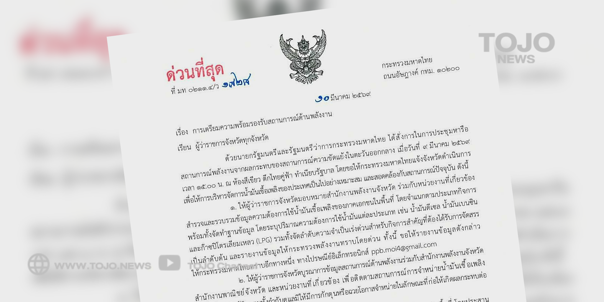 ผู้สื่อข่าวโตโจ้นิวส์รายงานว่า เมื่อวันที่ 10 มี.ค.69 นายอรรษิษฐ์ สัมพันธรัตน์ ปลัดกระทรวงมหาดไทย เปิดเผยถึงข้อสั่งการของนายอนุทิน ชาญวีรกูล นายกรัฐมนตรีและรัฐมนตรีว่าการกระทรวงมหาดไทย ที่ได้สั่งการให้กระทรวงมหาดไทยเร่งดำเนินการภายหลังการหารือสถานการณ์พลังงานจากผลกระทบของสถานการณ์ความขัดแย้งในตะวันออกกลาง เมื่อวันที่ 9 มี.ค. 69 ที่ผ่านมา