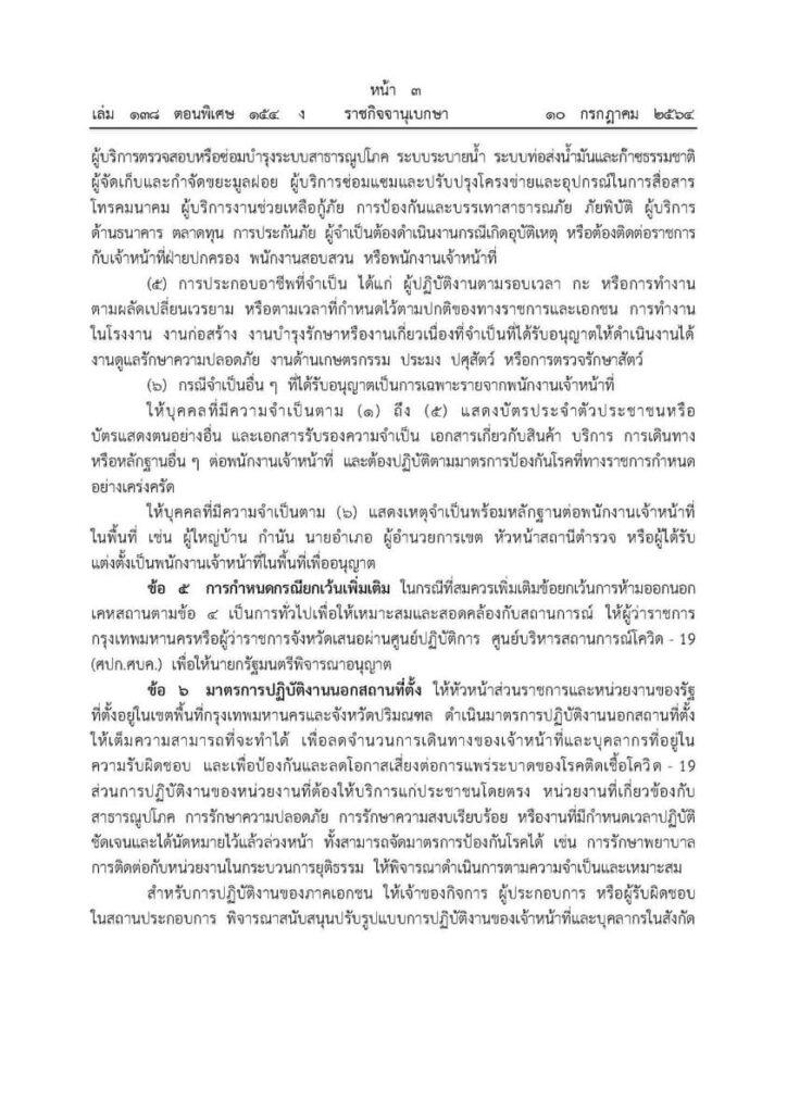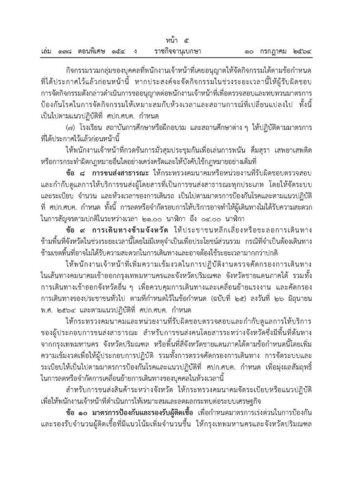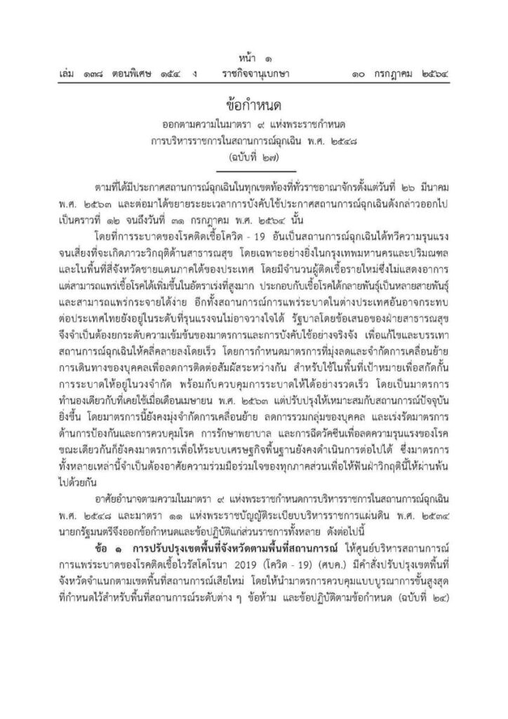 ผู้สื่อข่าวโตโจ้นิวส์รายงานว่า ราชกิจจานุเบกษาเผยแพร่ข้อกำหนดออกตามความในมาตรา 9 แห่งพ.ร.ก.ฉุกเฉิน ฉบับที่ 27 มีเนื้อหาสรุปว่า จากการระบาดที่รุนแรงโดยเฉพาะพื้นที่กทม. ปริมณฑล และ 4 จังหวัดชายแดนภาคใต้ ประกอบกับเชื้อโรคได้กลายพันธุ์สามารถแพร่กระจายได้ง่าย รัฐบาลจำเป็นต้องยกระดับความเข้มข้นของมาตรการ โดยมุ่งลดและจำกัดการเคลื่อนย้ายสำหรับพื้นที่เป้าหมาย เพื่อสกัดกั้นการแพร่ระบาดให้อยู่ในวงจำกัด และเร่งรัดมาตรการป้องกันควบคุมโรค การรักษาพยาบาล และการฉีดวัคซีน เพื่อลดความรุนแรงของโรค อาศัยอำนาจตามมาตรา 9 แห่ง พ.ร.ก.ฉุกเฉิน จึงออกข้อกำหนดปรับปรุงพื้นที่จังหวัดตามพื้นที่สถานการณ์ โดยให้ ศบค. ปรับปรุงเขตพื้นที่ตามสถานการณ์เสียใหม่ โดยห้ามออกนอกเคหสถาน เว้นแต่ได้รับอนุญาตจากพนักงานเจ้าหน้าที่ในเขตพื้นที่กทม. นครปฐม นนทบุรี ปทุมธานี สมุทรปราการ สมุทรสาคร นราธิวาส ปัตตานี ยะลา สงขลา ระหว่างเวลา 21.00-04.00 น. ต่อเนื่องเป็นเวลา 14 วันนับจากข้อกำหนดนี้ใช้บังคับ ผู้ใดฝ่าฝืนมีความผิดตามพ.ร.ก.ฉุกเฉิน
