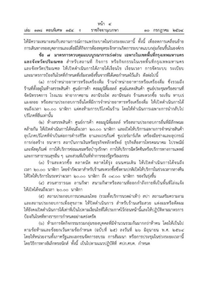 สำหรับสวนสาธารณะ ลานกีฬา ที่เป็นพื้นที่โล่งแจ้งให้เปิดได้ถึงเวลา 20.00 น. ส่วนสถานประกอบการนวดแผนไทย สปา สถานเสริมความงาม ให้ปิดดำเนินการ ,ร้านเสริมสวย แต่งผม ตัดผม ยังคงเปิดดำเนินการได้เท่าที่เป็นไปตามเงื่อนไขที่ประกาศไว้ก่อนหน้านี้