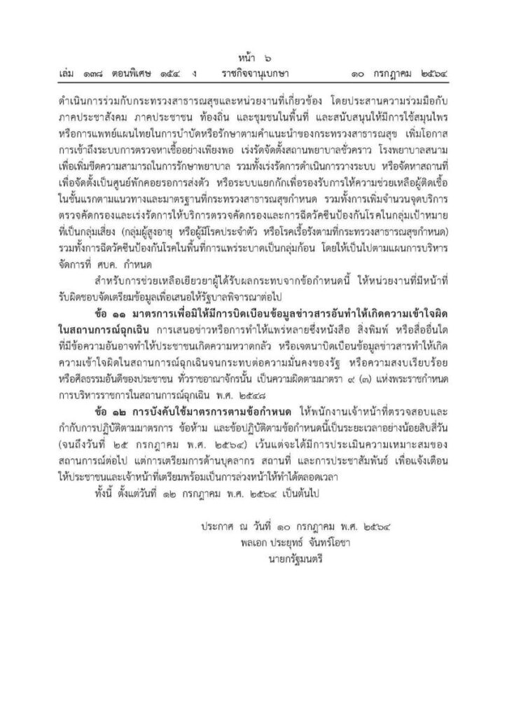นอกจากนี้ยังมีมาตรการเพื่อมิให้มีการบิดเบือนข้อมูลข่าวสารอันทำให้เกิดความเข้าใจผิดในสถานการณ์ฉุกเฉิน การเสนอข่าวหรือการทำให้เกิดการเผยแพร่ ซึ่งหนังสือ สิ่งพิมพ์ หรือสื่ออื่นใด ซึ่งมีความอาจทำให้ประชาชนเกิดความหวาดกลัว หรือมีเจตนาบิดเบือนข้อมูลข่าวสาร ทำให้เกิดความเข้าใจผิดในสถานการณ์ฉุกเฉิน กระทบต่อความมั่นคงของรัฐหรือความเรียบร้อย ถือเป็นความผิดตามมาตรา 9 (3) แห่งพ.ร.ก.ฉุกเฉิน โดยให้พนักงาน เจ้าหน้าที่ปฏิบัติตามมาตรการข้อห้ามและข้อปฏิบัติตามข้อกำหนดนี้เป็นระยะเวลาอย่างน้อย 14 วัน จนถึงวันที่ 25 ก.ค. เว้นแต่จะมีการประเมินความเหมาะสมสถานการณ์ต่อไป ทั้งนี้ตั้งแต่วันที่ 12 ก.ค.เป็นต้นไป