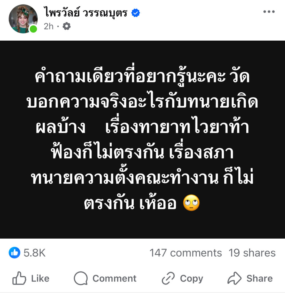 คำถามเดียวที่อยากรู้นะคะ วัดบอกความจริงอะไรกับทนายเกิดผลบ้าง เรื่องทายาทไวยาท้าฟ้องก็ไม่ตรงกัน เรื่องสภาทนายความตั้งคณะทำงาน ก็ไม่ตรงกัน เห้ออ