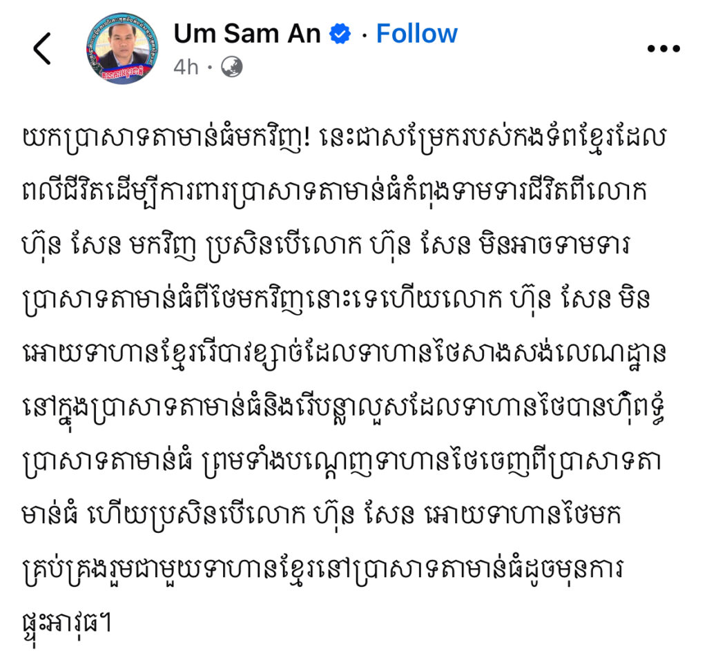 ผู้สื่อข่าวโตโจ้นิวส์รายงานว่า ผู้ใช้เฟซบุ๊ก ชื่อ Um Sam An ซึ่งเป็นชาวกัมพูชา โพสต์ข้อความผ่านเฟซบุ๊ก ระบุว่า