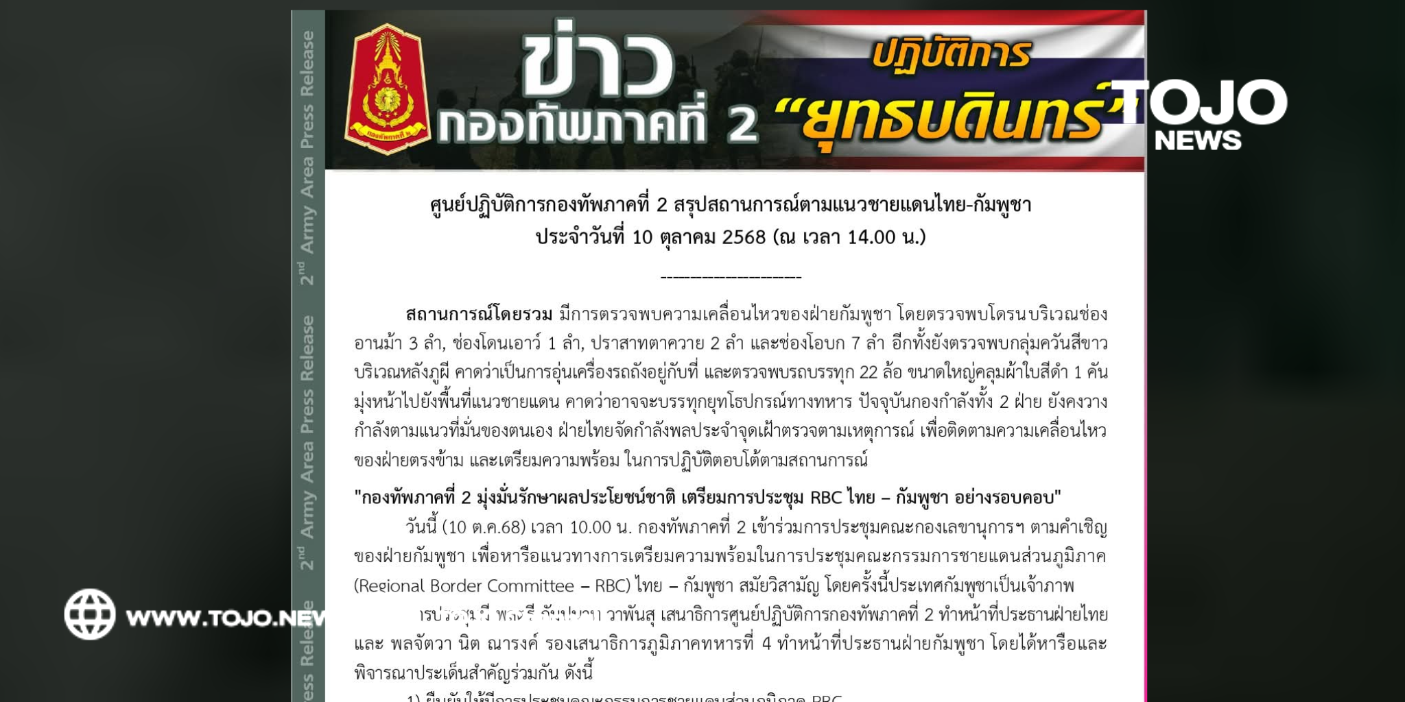 ผู้สื่อข่าวโตโจ้นิวส์รายงานว่า ศูนย์ปฏิบัติการกองทัพภาคที่ 2 สรุปสถานการณ์ตามแนวชายแดนไทย-กัมพูชา