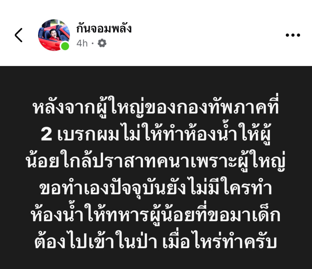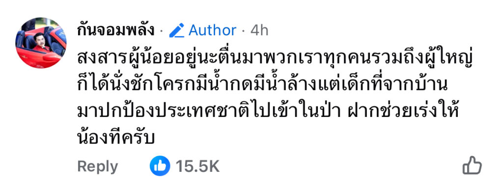 กันจอมพลัง ยังแสดงความคิดเห็นอีกว่า สงสารผู้น้อยอยู่นะตื่นมาพวกเราทุกคนรวมถึงผู้ใหญ่ ก็ได้นั่งชักโครกมีน้ำกดมีน้ำล้างแต่เด็กที่จากบ้านมาปกป้องประเทศชาติไปเข้าในป่า ฝากช่วยเร่งให้น้องทีครับ