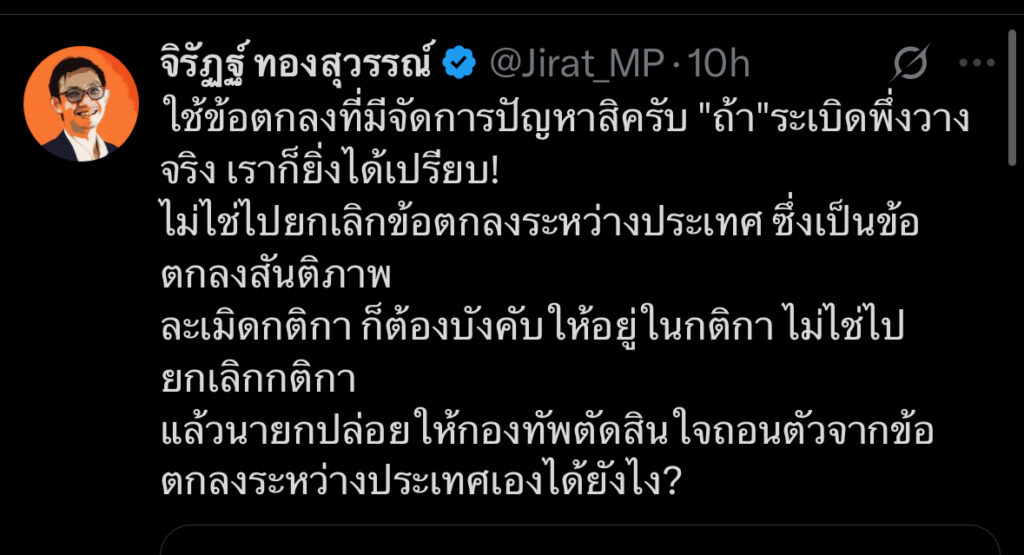 จิรัฏฐ์ ชี้ ให้ใช้ข้อตกลงที่มีจัดการปัญหาชายแดนกัมพูชา ถาม นายกฯ ปล่อยให้กองทัพตัดสินใจถอนตัวได้ยังไง?