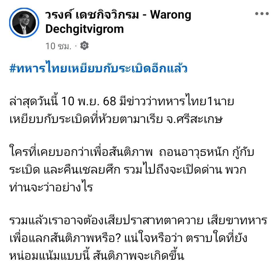 ล่าสุด 10 พ.ย. 68 มีข่าวว่าทหารไทย 1 นาย เหยียบกับระเบิดที่ห้วยตามาเรีย จ.ศรีสะเกษ