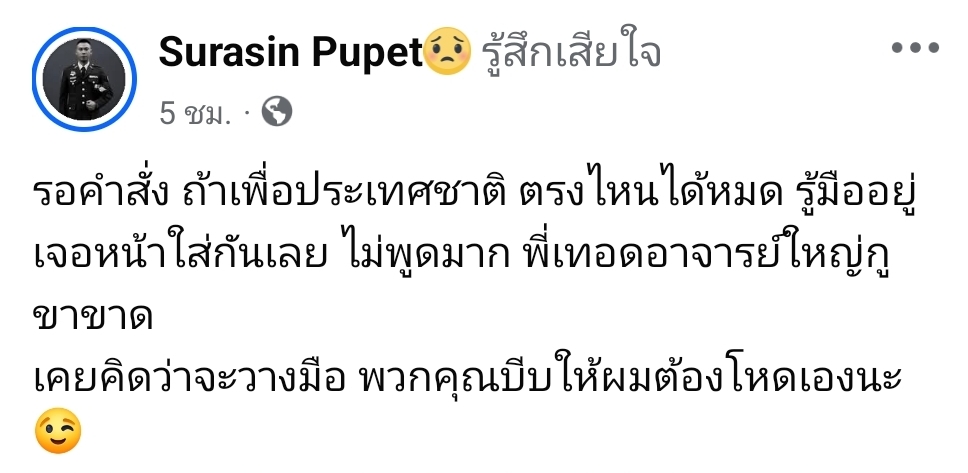 ขณะที่โพสต์ต่อมาได้ระบุว่า… รอคำสั่ง ถ้าเพื่อประเทศชาติ ตรงไหนได้หมด รู้มืออยู่
