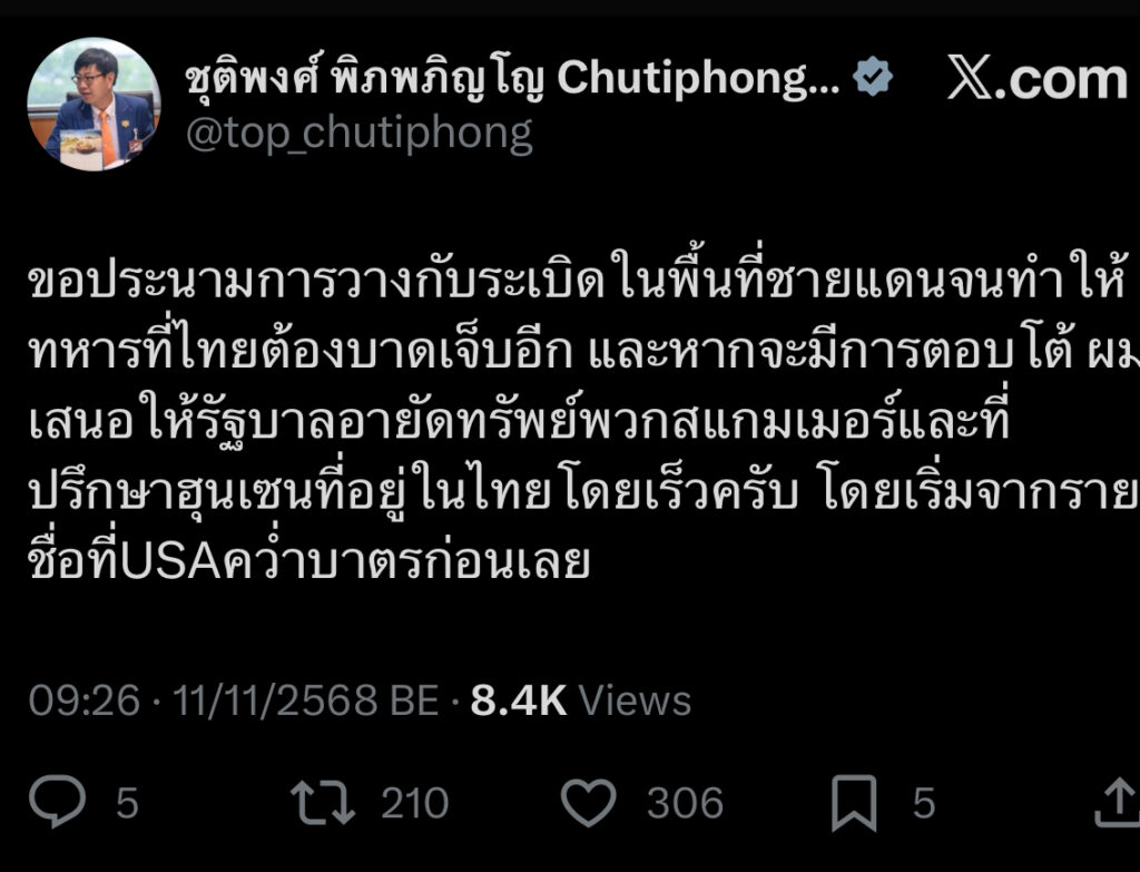 ขอประนามการวางกับระเบิดในพื้นที่ชายแดนจนทำให้ทหารที่ไทยต้องบาดเจ็บอีก และหากจะมีการตอบโต้ ผมเสนอให้รัฐบาลอายัดทรัพย์พวกสแกมเมอร์และที่ปรึกษาฮุนเซนที่อยู่ในไทยโดยเร็วครับ โดยเริ่มจากรายชื่อที่USAคว่ำบาตรก่อนเลย