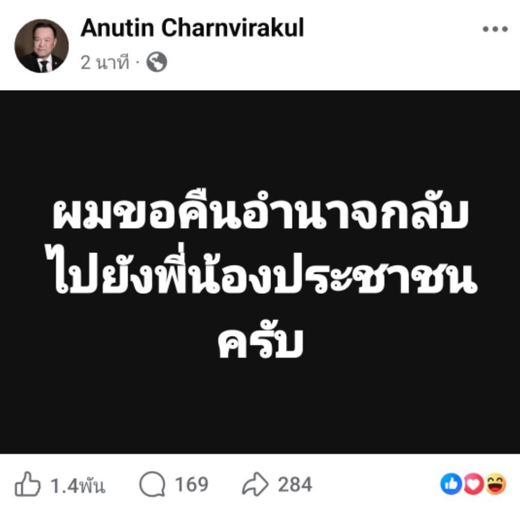 ผู้สื่อข่าวโตโจ้นิวส์รายงานว่า วันนี้ (11 ธ.ค. 68) นายอนุทิน ชาญวีรกูล นายกรัฐมนตรีและรัฐมนตรีว่าการกระทรวงมหาดไทย โพสต์ผ่านเพจเฟซบุ๊กส่วนตัว ภายหลังมีกระแสข่าวว่า นายกรัฐมนตรี ได้มีการกราบบังคมทูล เพื่อทรงพระกรุณาโปรดเกล้าฯ พระราชกฤษฎีกายุบสภาผู้แทนราษฎรเป็นที่เรียบร้อยแล้ว โดยระบุว่า ”ผมขอคืนอำนาจกลับไปยังพี่น้องประชาชนครับ“