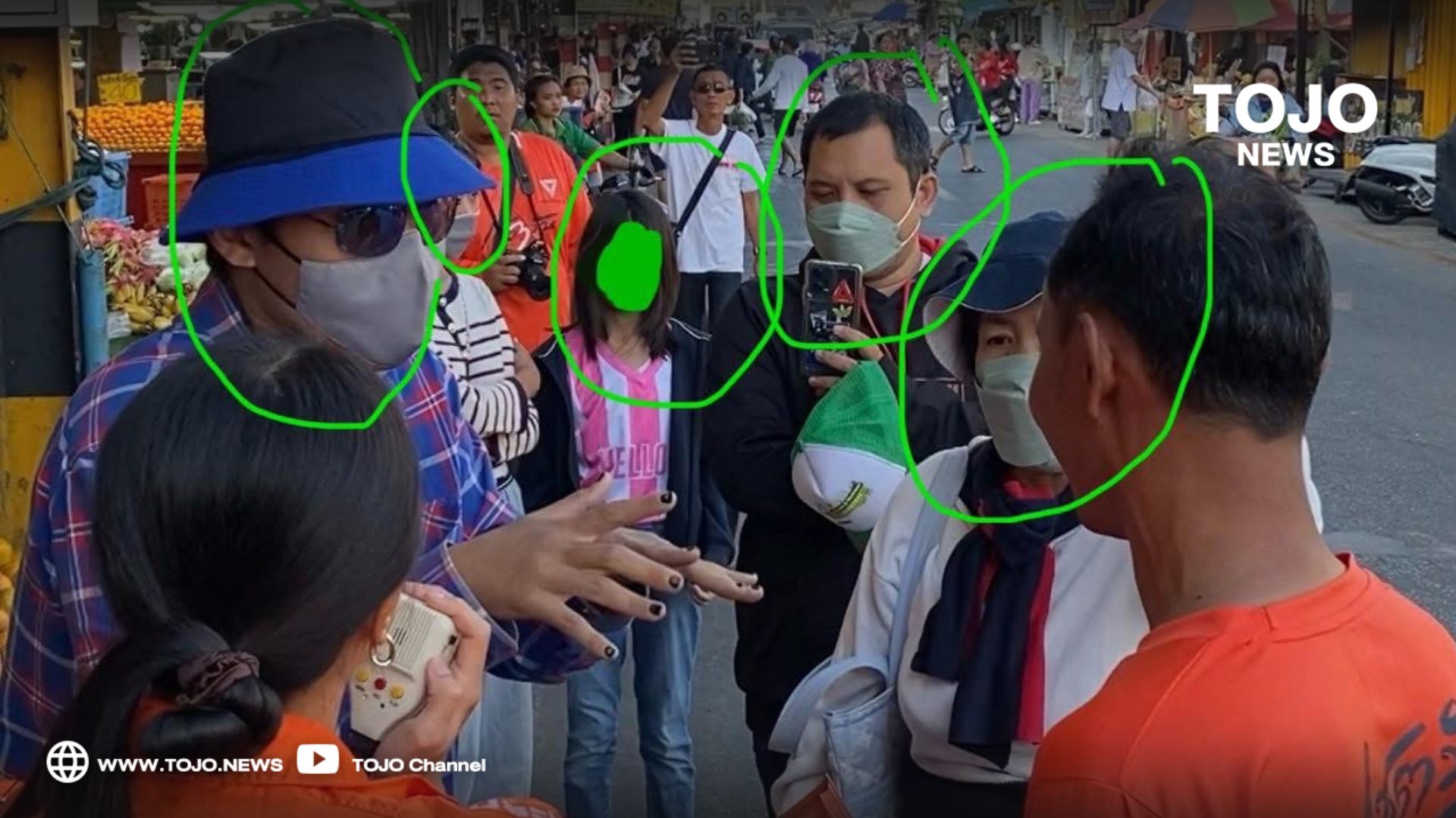 2 คนขวา ป้าสวมหมวก ใส่แมส กับคนถ่ายคลิปส่งสื่อ แมสแบบเดียวกัน