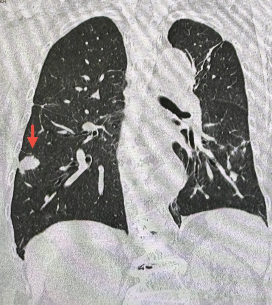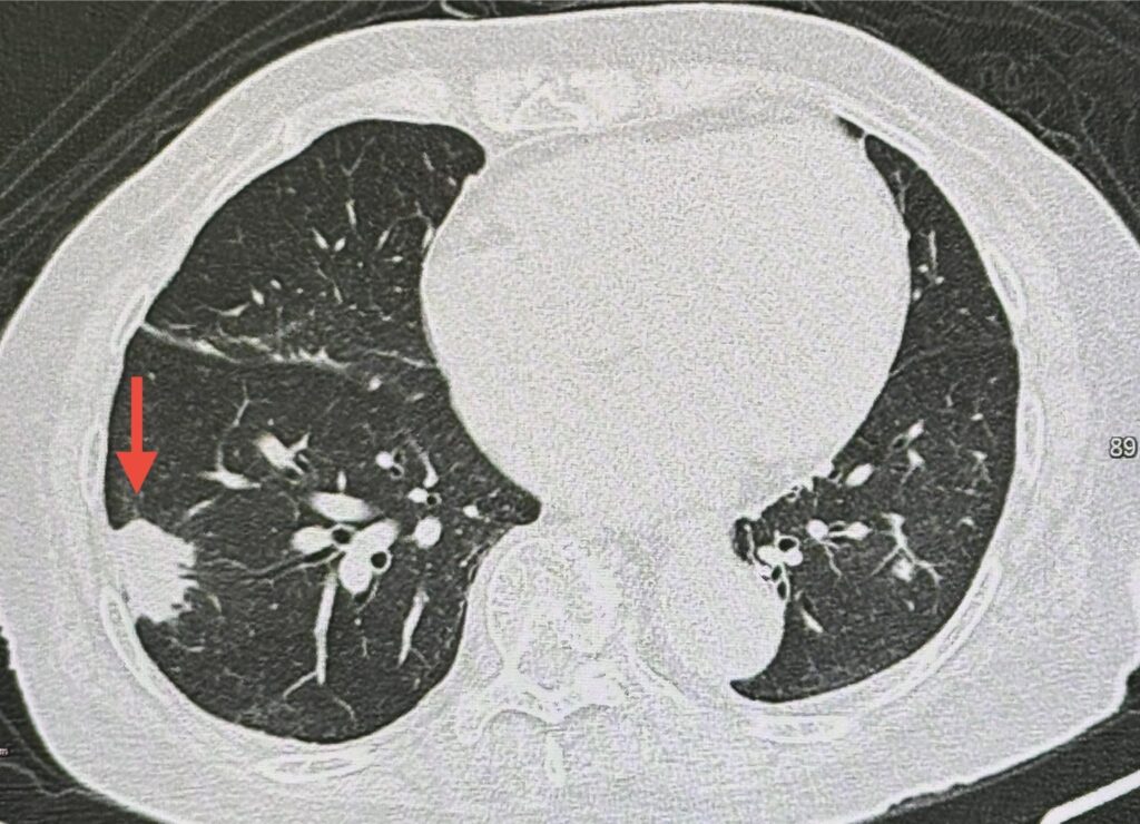 ตรวจร่างกาย ไม่มีไขั ฟังปอดปกติ เอกซเรย์ปอด มีเงาผิดปกติปอดข้างขวาด้านบนจากเคยป่วยเป็นวัณโรค และมีก้อนขนาด 1.9 x 1.9 เซนติเมตรที่ปอดข้างขวาด้านล่าง (ดูรูป) ก้อนนี้เป็นก้อนใหม่เพิ่งพบครั้งแรก ปีที่แล้วไม่มีก้อน ทำคอมพิวเตอร์ปอด พบก้อนขนาด 3.0 × 2.4 × 2.0 เซนติเมตรที่ปอดข้างขวาด้านล่าง ตรวจเลือด ค่ามะเร็งทุกตัวปกติ