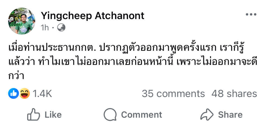 เมื่อท่านประธานกกต. ปรากฏตัวออกมาพูดครั้งแรก เราก็รู้แล้วว่า ทำไมเขาไม่ออกมาเลยก่อนหน้านี้ เพราะไม่ออกมาจะดีกว่า