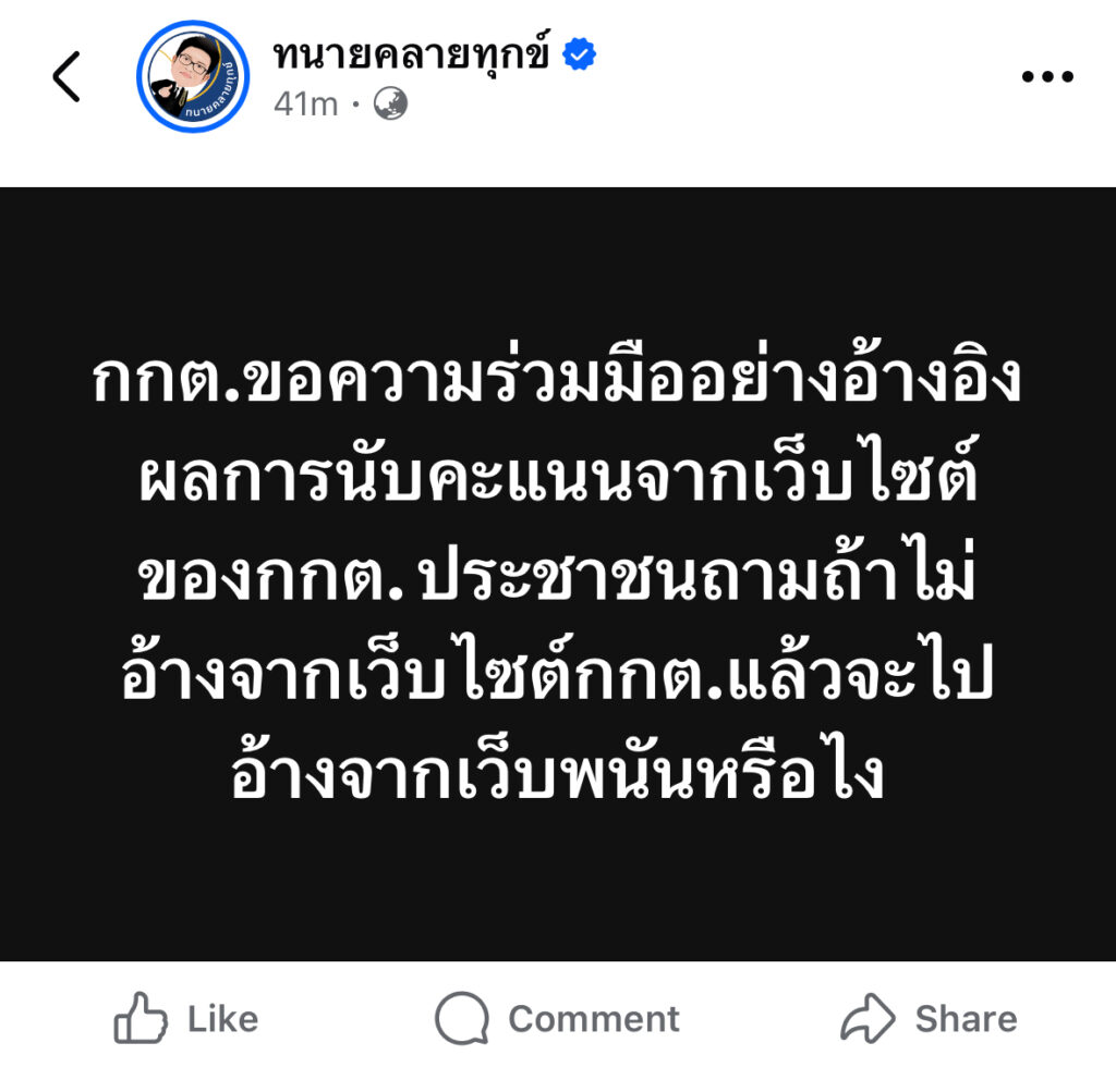 กกต.ขอความร่วมมืออย่างอ้างอิงผลการนับคะแนนจากเว็บไซต์ ของกกต. ประชาชนถามถ้าไม่อ้างจากเว็บไซต์กกต.แล้วจะไปอ้างจากเว็บพนันหรือไง
