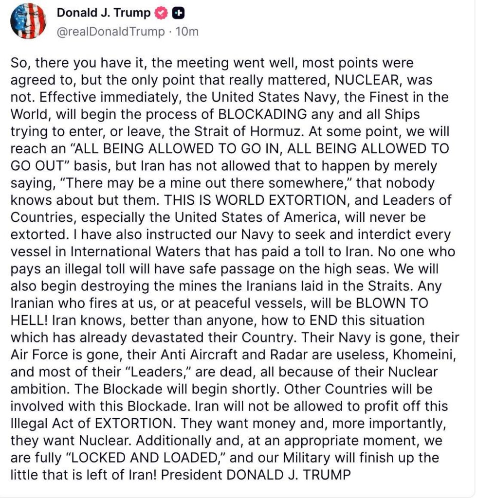 สรุปแล้ว การประชุมเป็นไปด้วยดี ประเด็นส่วนใหญ่เห็นพ้องกัน แต่ประเด็นเดียวที่สำคัญที่สุด คือเรื่องนิวเคลียร์ กองทัพเรือสหรัฐฯ ซึ่งเป็นกองทัพเรือที่ดีที่สุดในโลก จะเริ่มดำเนินการปิดล้อมเรือทุกลำที่พยายามเข้าหรือออกจากช่องแคบฮอร์มุซโดยทันที ในที่สุด เราจะบรรลุข้อตกลงที่ว่า “ทุกลำได้รับอนุญาตให้เข้าและออก” แต่ทางอิหร่านไม่ยอมให้เป็นเช่นนั้น โดยอ้างว่า “อาจมีทุ่นระเบิดอยู่แถวนั้น” ซึ่งไม่มีใครรู้ นอกจากพวกเขา