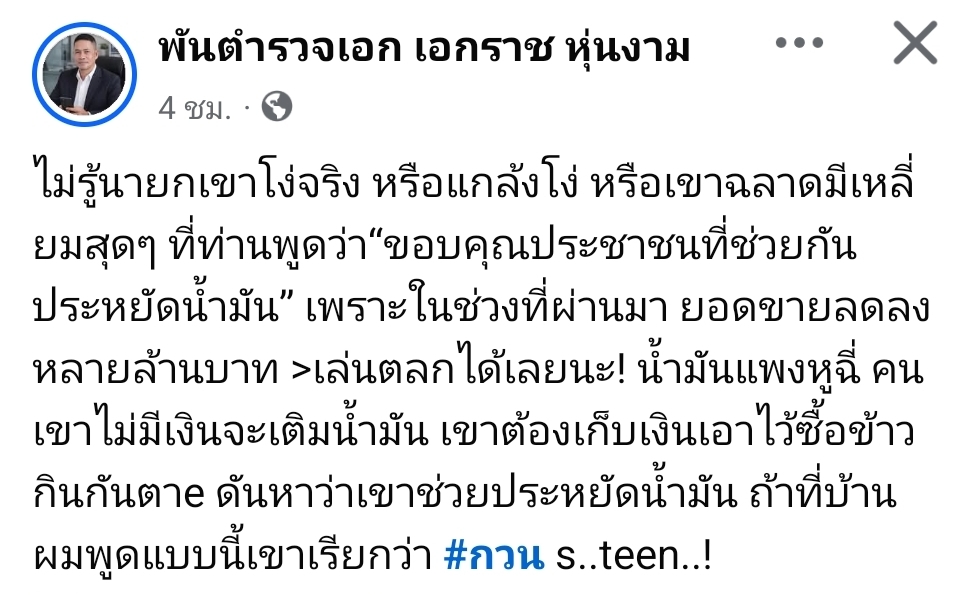 พ.ต.อ.เอกราช ถาม! หรือนายกฯ เหลี่ยมสุดๆ ที่ท่านพูดว่า“ขอบคุณประชาชนที่ช่วยกันประหยัดน้ำมัน”