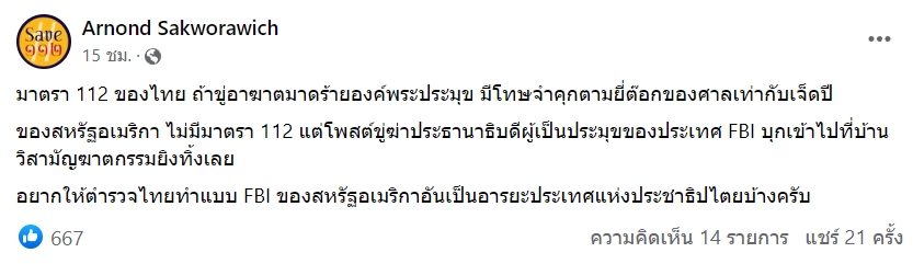 ของสหรัฐอเมริกา ไม่มีมาตรา 112 แต่โพสต์ขู่ฆ่าประธานาธิบดีผู้เป็นประมุขของประเทศ FBI บุกเข้าไปที่บ้านวิสามัญฆาตกรรมยิงทิ้งเลย
