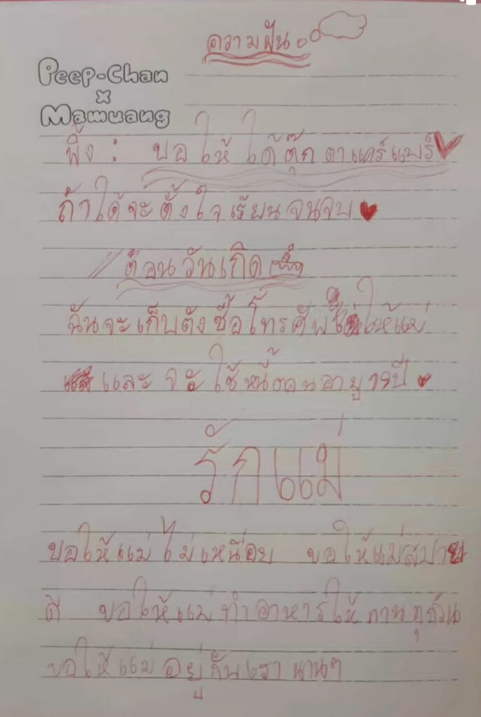 ผู้สื่อข่าวโตโจ้นิวส์รายงานว่า ผู้ใช้เฟซบุ๊ก ชื่อ Laddawan Nafu โพสต์รูปจดหมายที่ลูกน้อยเขียนไว้ให้และข้อความ ระบุว่า เขามาแอบเขียนไว้ในสมุดตั้งแต่เมื่อไหร่ไม่รู้ พอเรารื้อสมุดแล้วเปิดมาเจอข้อความพวกนี้ เรานั่งร้องไห้หนักมาก เขาได้ยินเราพูดอยู่บ่อยๆว่าโทรศัพท์เเม่เก่ามากแล้วใช้งานก็ไม่ดีเหมือนโทรศัพท์ใหม่ๆเพราะใช้มาหลายปีแล้ว แต่ยังไม่พร้อมซื้อใหม่เพราะบอกตลอดว่าต้องประหยัดเพราะแม่มีหนี้ที่จะต้องใช้ และเขามักจะเห็นว่า แม่ต้องขนของขึ้นรถ ไปนั่งขายของตลาดเช้า ตั้งร้านเช้ามืด และเก็บร้าน เกือบ 10:00 น และไปทำงานประจำต่อ เลิกงานมาก็ค่ำแล้วนอนดึกตื่นเช้า ข้อความเหล่านี้ มันบีบหัวใจคนเป็นแม่อย่างเรามาก