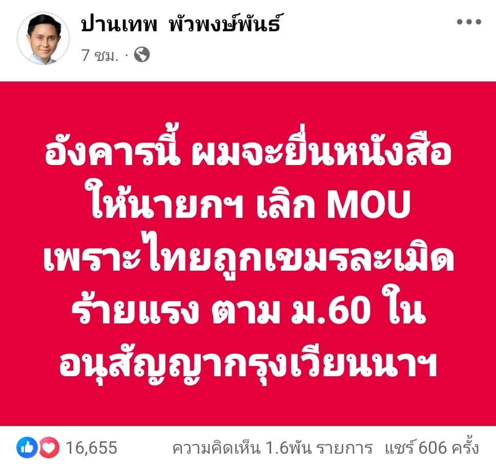 ผู้สื่อข่าวโตโจ้นิวส์รายงานว่า นายปานเทพ พัวพงษ์พันธ์ ประธานมูลนิธิยามเฝ้าแผ่นดิน โพสต์เฟซบุ๊ก ระบุว่า อังคารนี้ ผมจะยื่นหนังสือให้นายกฯ เลิก MOU เพราะไทยถูกเขมรละเมิดร้ายแรง ตาม ม.60 ในอนุสัญญากรุงเวียนนาฯ