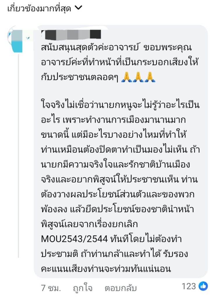 ใจจริงไม่เชื่อว่านายกหนูจะไม่รู้ว่าอะไรเป็นอะไร เพราะทำงานการเมืองมานานมากขนาดนี้ แต่มีอะไรบางอย่างไหมที่ทำให้ท่านเหมือนต้องปิดตาทำเป็นมองไม่เห็น ถ้านายกมีความจริงใจและรักชาติบ้านเมืองจริงและอยากพิสูจน์ให้ประชาชนเห็น ท่านต้องวางผลประโยชน์ส่วนตัวและของพวกพ้องลง แล้วยึดประโยชน์ของชาตินำหน้า พิสูจน์เลยจากเรื่องยกเลิก MOU2543/2544 ทันทีโดยไม่ต้องทำประชามติ ถ้าท่านกล้าและทำได้ รับรองคะแนนเสียงท่านจะท่วมท้นแน่นอน