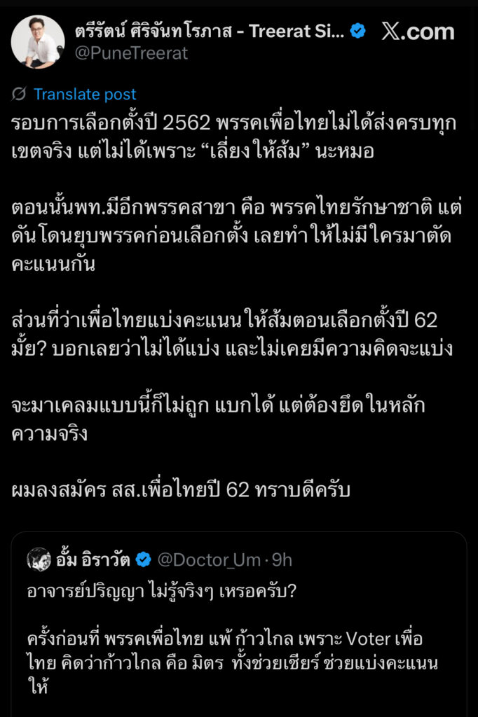 ตรีรัตน์ โต้ หมออั้ม เลือกตั้งปี 62 เพื่อไทยไม่ได้ส่งครบทุกเขต ไม่ใช่เพราะจะแบ่งคะแนนพรรคส้ม