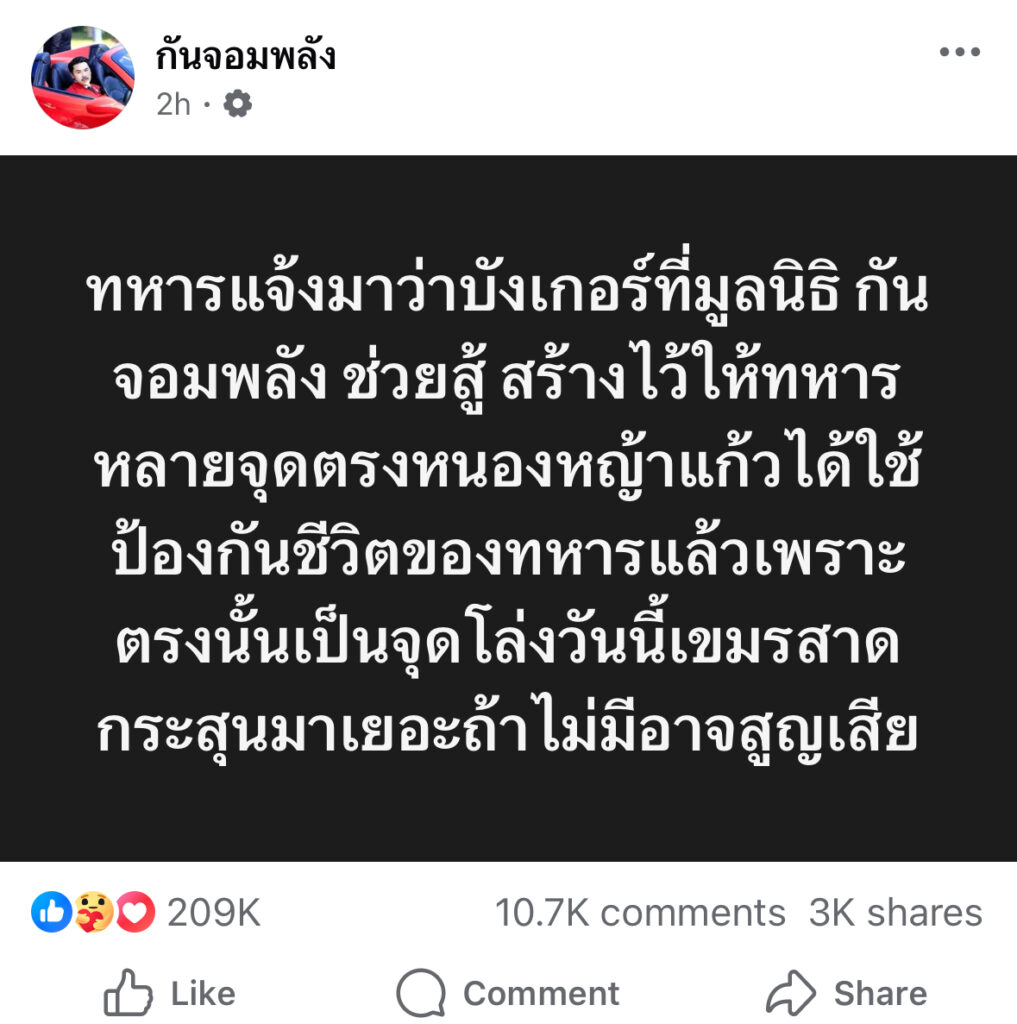 ทหารแจ้งมาว่าบังเกอร์ที่มูลนิธิ กันจอมพลัง ช่วยสู้ สร้างไว้ให้ทหารหลายจุดตรงหนองหญ้าแก้วได้ใช้ป้องกันชีวิตของทหารแล้วเพราะ