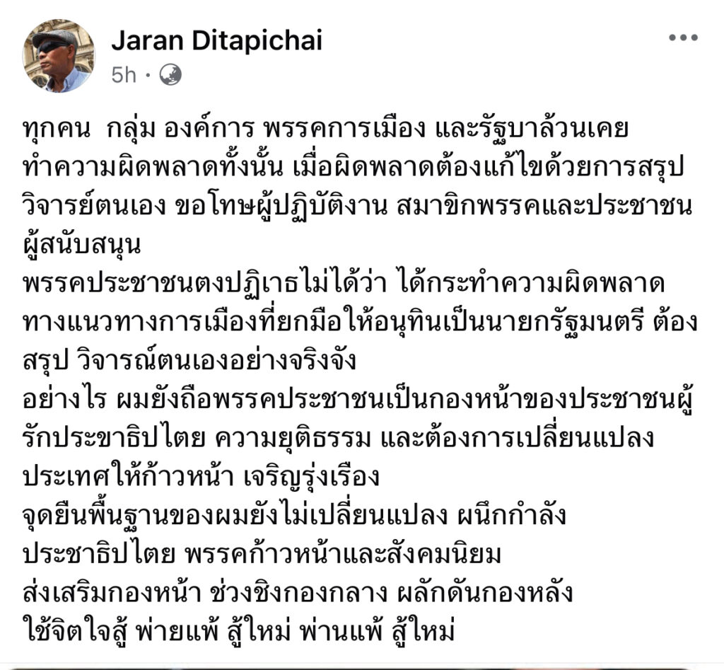 อย่างไร ผมยังถือพรรคประชาชนเป็นกองหน้าของประชาชนผู้รักประขาธิปไตย ความยุติธรรม และต้องการเปลี่ยนแปลงประเทศให้ก้าวหน้า เจริญรุ่งเรือง