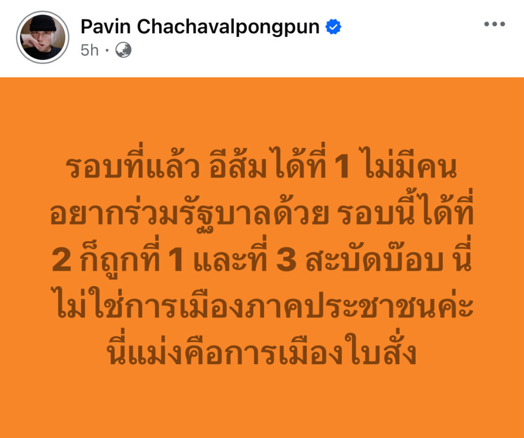 รอบที่แล้ว อีส้มได้ที่ 1 ไม่มีคนอยากร่วมรัฐบาลด้วย รอบนี้ได้ที่ 2 ก็ถูกที่ 1 และที่ 3 สะบัดบ๊อบ นี่ไม่ใช่การเมืองภาคประชาชนค่ะ นี่แม่งคือการเมืองใบสั่ง