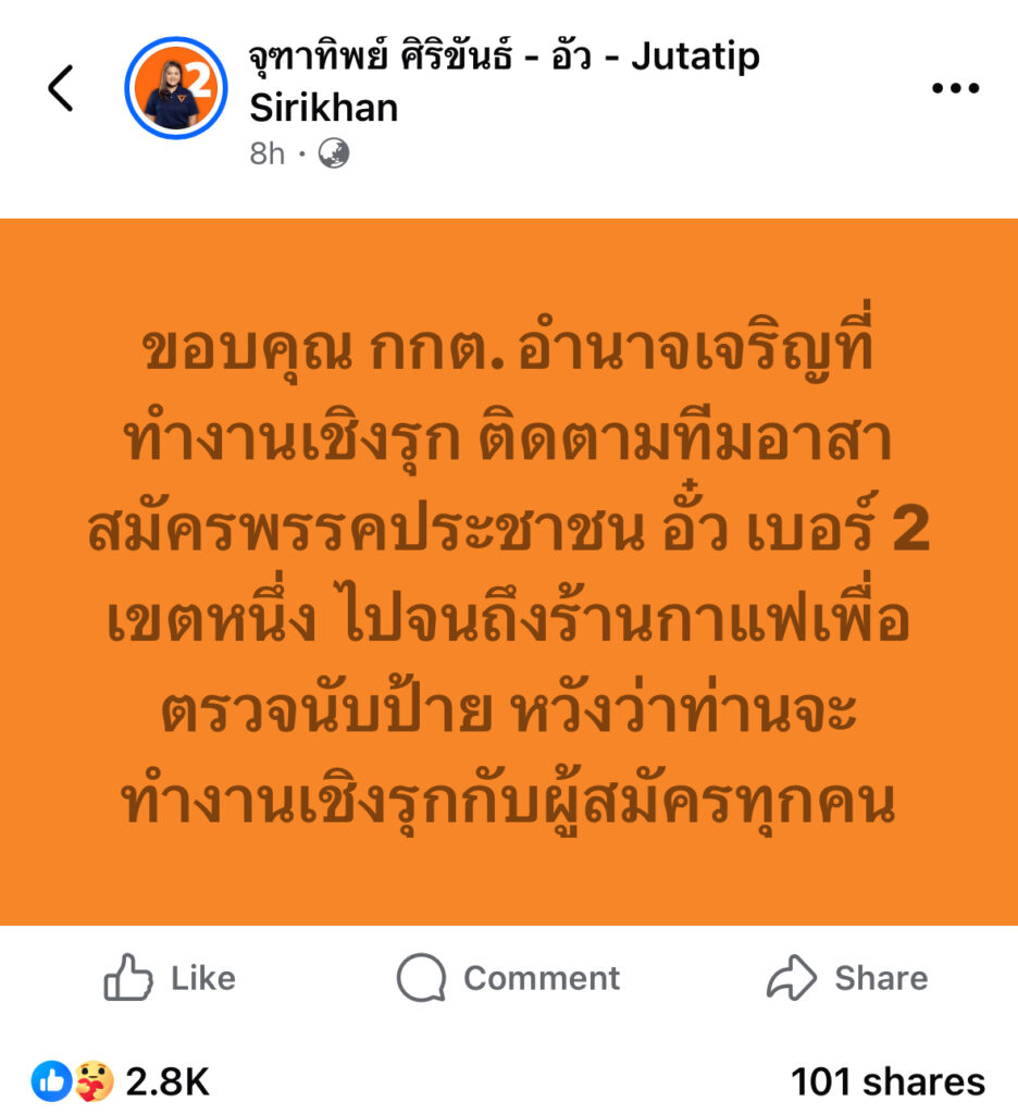 ขอบคุณ กกต. อำนาจเจริญที่ทำงานเชิงรุก ติดตามทีมอาสาสมัครพรรคประชาชน อั๋ว เบอร์ 2 เขตหนึ่ง ไปจนถึงร้านกาแฟเพื่อตรวจนับป้าย หวังว่าท่านจะทำงานเชิงรุกกับผู้สมัครทุกคน