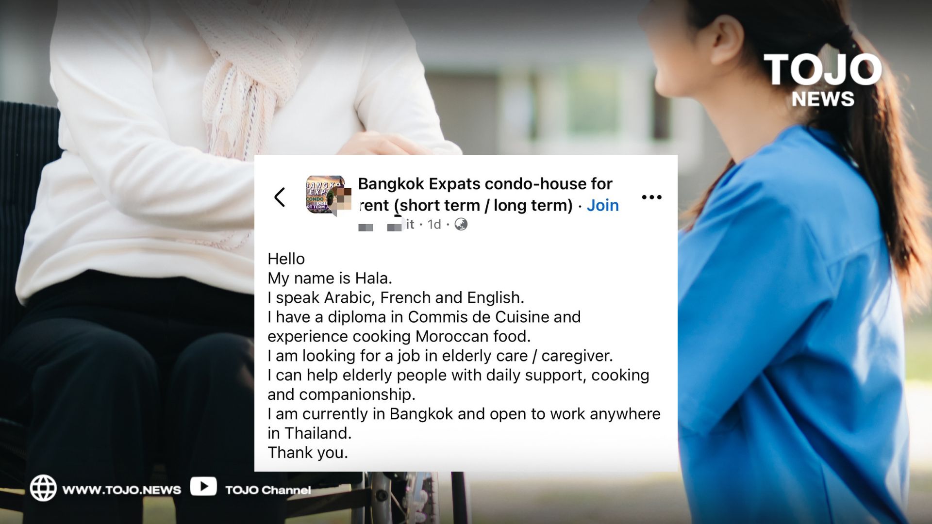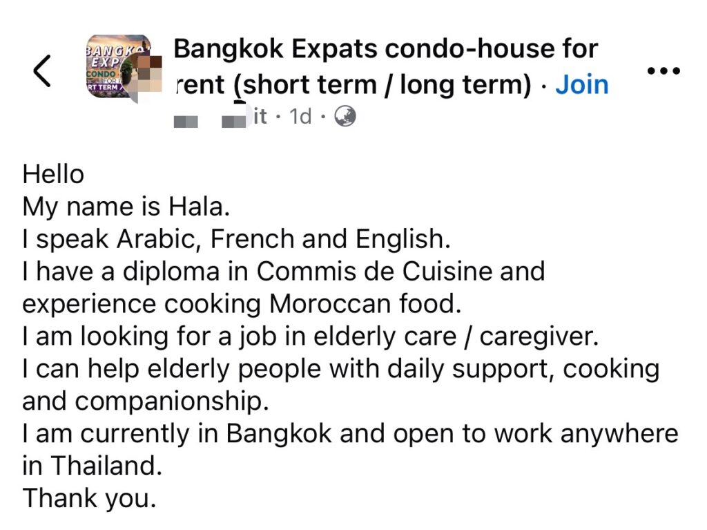 เปิดโพสต์ชาวต่างชาติ หางานดูแลผู้สูงอายุทำในประเทศไทย พร้อมทำงานทุกที่