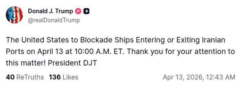 สหรัฐอเมริกาจะปิดล้อมเรือที่เข้าหรือออกจากท่าเรืออิหร่านในวันที่ 13 เมษายน เวลา 10:00 น. ตามเวลาภาคตะวันออก ขอขอบคุณที่ให้ความสนใจในเรื่องนี้!