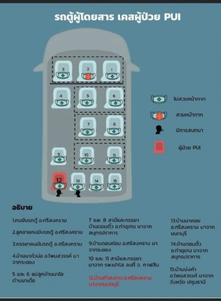 โดยผู้โดยสารทั้งหมดมีความสัมผัสเสี่ยงสูงมาก เพราะผู้ป่วยระหว่างโดยสารมาแม้จะนั่งที่เบาะหลังสุด แต่ไม่สวมแมสก์ตลอดเวลา ขณะที่ทั้งรถมีเพียงลูกชายคนขับเท่านั้นที่สวมแมสก์ นอกนั้นไม่มีใครสวมแม้แต่คนเดียว จึงมีโอกาสติดเชื้อโควิดทั้งรถตู้