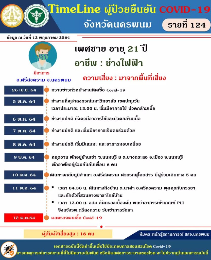 ผู้สื่อข่าวโตโจ้นิวส์รายงานว่า นายไกรสร กองฉลาด ผู้ว่าราชการจังหวัดนครพนม แถลงสถานการณ์การแพร่ระบาดของเชื้อไวรัสโควิด-19 โดยพบผู้ติดเชื้อใหม่เพิ่ม 1 ราย เป็นชายอายุ 21 ปี เป็นช่างไฟฟ้าอยู่ในพื้นที่เสี่ยงสูง จ.นนทบุรี หลังหัวหน้างานติดเชื้อโควิดช่วงปลายเดือน เม.ย. แต่ตัวเองไม่ยอมเข้ารับการตรวจค้นหาเชื้อยังคงไปทำงานตามปกติ