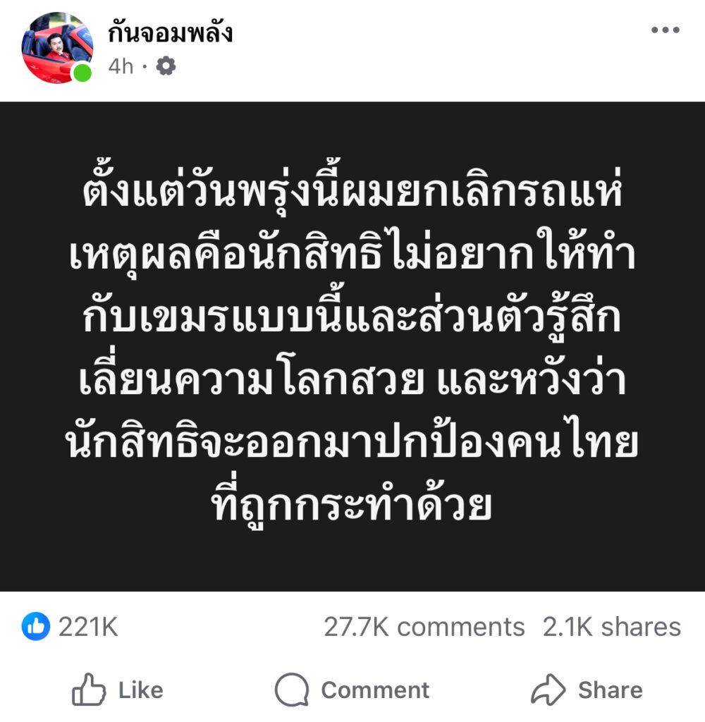 ผู้สื่อข่าวโตโจ้นิวส์รายงานว่า กัณฐัศว์ พงศ์ไพบูลย์เวชย์ หรือกัน จอมพลัง โพสต์ข้อความผ่านเฟซบุ๊ก ระบุว่า