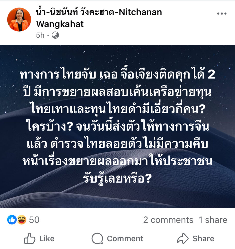 น้ำ นิชนันท์ จี้ ตำรวจไทย จนวันนี้ส่งตัวเฉอ จื้อเจียง ให้จีนแล้ว ยังไม่แถลงเรื่องขยายผลให้ประชาชนรับรู้
