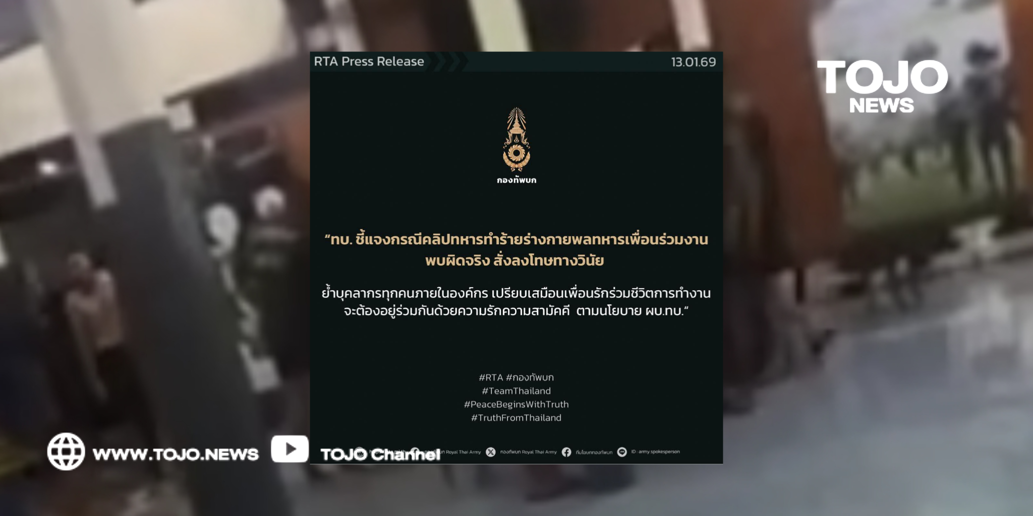 “ทบ. ชี้แจงกรณีคลิปทหารทำร้ายร่างกาย พลทหารเพื่อนร่วมงาน พบผิดจริง สั่งลงโทษทางวินัย ย้ำบุคลากรทุกคนภายในองค์กร เปรียบเสมือนเพื่อนรักร่วมชีวิตการทำงาน จะต้องอยู่ร่วมกันด้วยความรัก ความสามัคคี