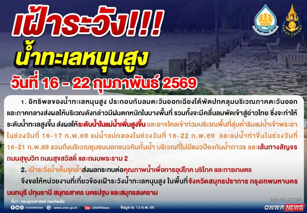 ส่งผลให้ระดับน้ำในแม่น้ำเพิ่มสูงขึ้น และอาจไหลเข้าท่วมบริเวณพื้นที่ลุ่มต่ำริมแม่น้ำเจ้าพระยาในช่วงวันที่ 16-17 ก.พ.69 แม่น้ำแม่กลองในช่วงวันที่ 16-22 ก.พ.69 และแม่น้ำท่าจีนในช่วงวันที่ 16-21 ก.พ.69 รวมถึงบริเวณชุมชนนอกแนวคันกั้นน้ำ บริเวณที่ไม่มีแนวป้องกันน้ำถาวร และเส้นทางสัญจรถนนสุขุมวิท ถนนสุขสวัสดิ์ และถนนพระราม 2