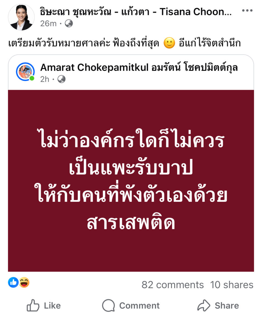 แก้วตา แชร์โพสต์อมรัตน์ เตรียมฟ้องถึงที่สุด