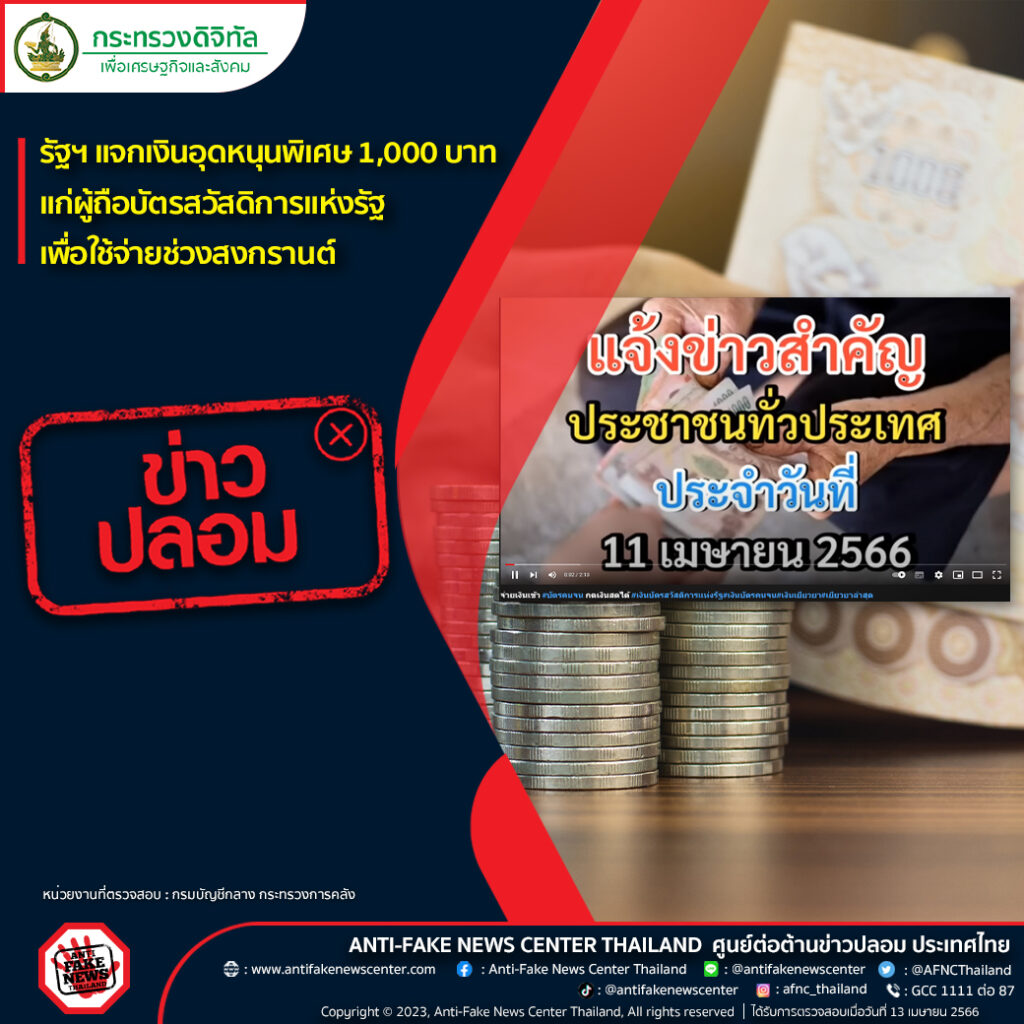 รัฐฯ แจกเงินอุดหนุนพิเศษ 1,000 บาทแก่ผู้ถือบัตรสวัสดิการแห่งรัฐเพื่อใช้จ่ายช่วงสงกรานต์ ข่าวแชร์เท็จ