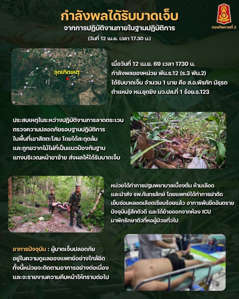 เมื่อวันที่ 12 เม.ย. 69 เวลา 17.30 น. กำลังพลของหน่วย พัน.ร.12 (ร.3 พัน.2) จำนวน 1 นาย ได้แก่ ส.อ. พีรภัท มัธุรถ ตำแหน่ง หน.ชุดยิง มว.ปล.ที่ 1 ร้อย.ร.123 ประสบเหตุในระหว่างปฏิบัติหน้าที่ในการลาดตระเวนตรวจความปลอดภัยรอบฐานปฏิบัติการในพื้นที่เขาสัตตะโสม โดยได้สะดุดล้มและถูกขวากไม้ไผ่ที่เป็นแนวป้องกันฐานแทงบริเวณหน้าขาซ้าย ส่งผลให้มีบาดแผลลึก และเสียเลือดจำนวนมาก