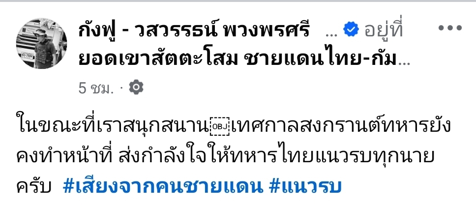 ในขณะที่เราสนุกสนานเทศกาลสงกรานต์ทหารยังคงทำหน้าที่ ส่งกำลังใจให้ทหารไทยแนวรบทุกนายครับ เสียงจากคนชายแดน แนวรบ