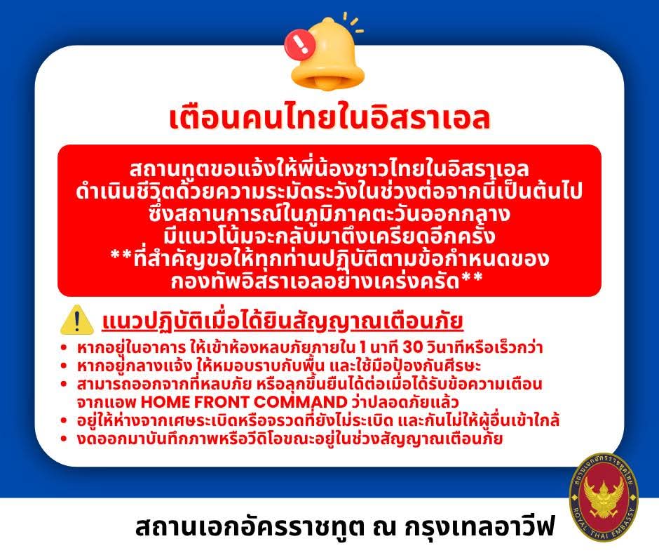 เรื่องเตือนคนไทยในอิสราเอล ให้ดำเนินชีวิตด้วยความระมัดระวังเนื่องจากสถานการณ์ในตะวันออกกลาง มีแนวโน้มตึงเครียดอีกครั้ง ขอให้ทุกคนปฏิบัติตามข้อกำหนดของกองทัพอิสราเอลอย่างเคร่งครัด