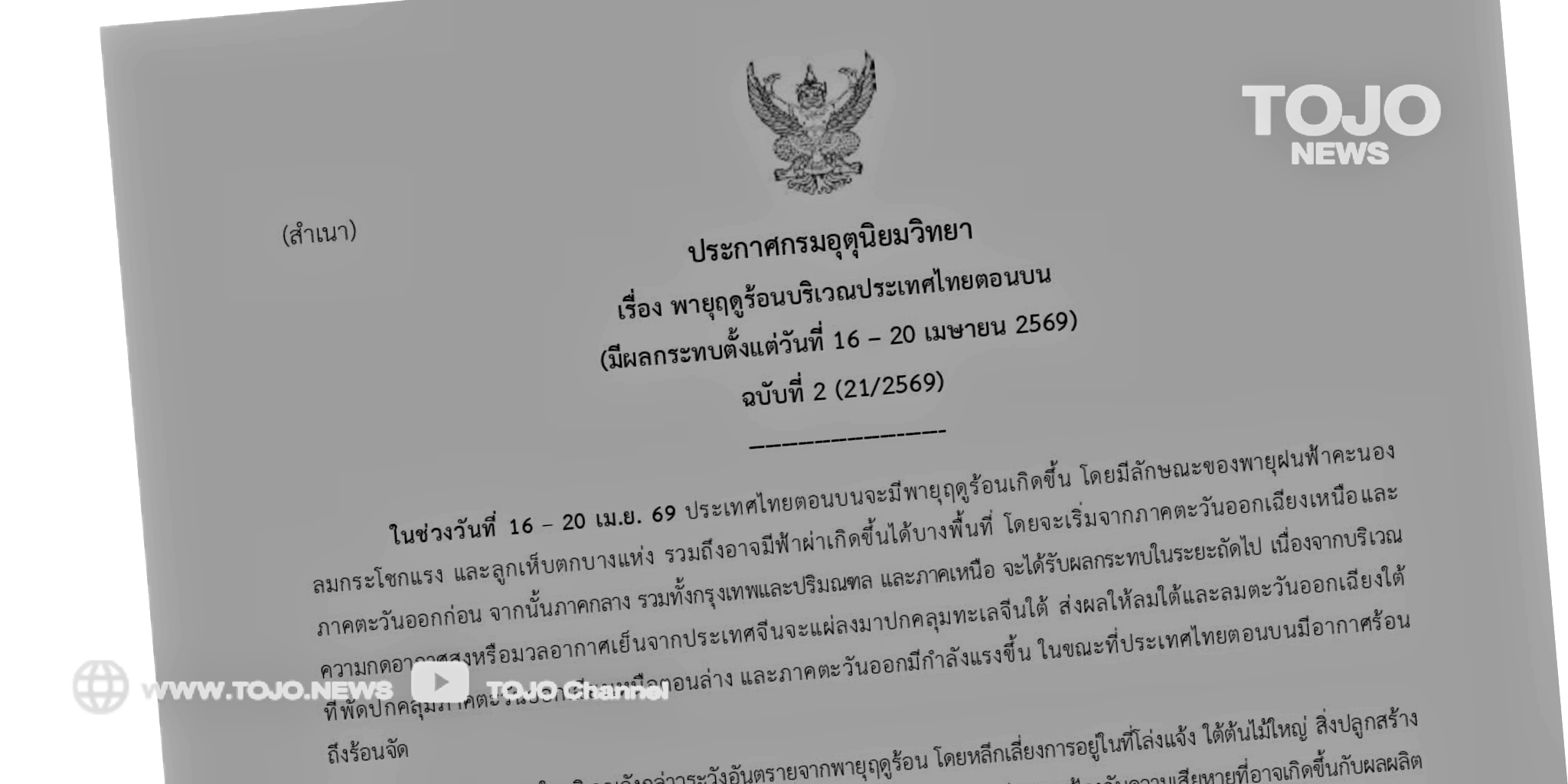 พายุฤดูร้อนบริเวณประเทศไทยตอนบน มีผลกระทบตั้งแต่วันที่ 16 – 20 เมษายน 2569