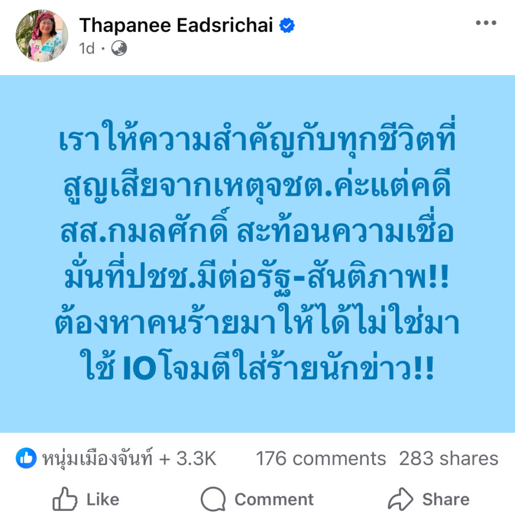 เราให้ความสำคัญกับทุกชีวิตที่สูญเสียจากเหตุจชต.ค่ะแต่คดีสส.กมลศักดิ์ สะท้อนความเชื่อมั่นที่ปชช.มีต่อรัฐ-สันติภาพ!!ต้องหาคนร้ายมาให้ได้ไม่ใช่มาใช้ IOโจมตีใส่ร้ายนักข่าว!!