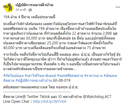 ผู้สื่อข่าวโตโจ้นิวส์รายงานว่า เพจปฏิบัติการหมาเฝ้าบ้าน ได้เผยแพร่ภาพพร้อมข้อความระบุว่า “194 ล้าน 4 ปีผ่าน เหลือประมาณนี้ ช่วงนี้เสาไฟกำลังร้อนแรง เลยพาไปย้อนดูโครงการเสาไฟฟ้าโซลาร์เซลล์ที่นครศรีธรรมราช วงเงิน 194 ล้านบาท เรื่องนี้หมาเฝ้าบ้านเคยเปิดประเด็นในราคาสูงเกินกว่าท้องตลาด ที่กำหนดติดตั้งใน 22 สายทาง จำนวน 2,998 ชุด ราคาตกเสาละ 65,000 บาท